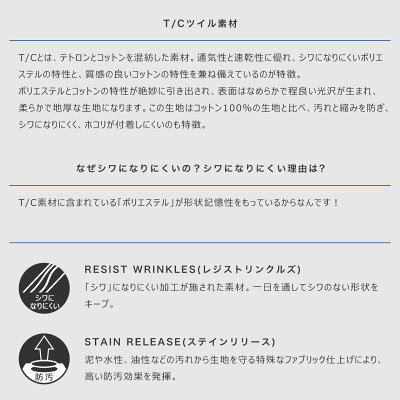 「ルーズフィットモデル」 ● 通気性と速乾性に優れ、シワになりにくいポリエステルの特性と、質感の良いコットンの特性を兼ね備えた特徴を持つ「T/Cツイル」素材を採用。