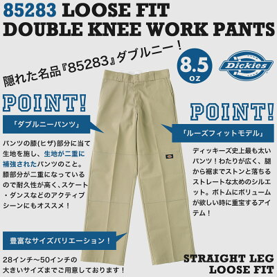 定番の太めのオリジナル ストレートパンツ「Dickies 874」の他に、やや細めのローライズ スリムパンツ「Dickies 873」や春夏の定番アイテム「Dickies 42283」のハーフパンツは永遠のマストアイテム! 商品説明・スペック ディッキーズ「874」の影に隠れた名品『85283』ダブルニー!28インチ〜50インチの大きいサイズまで!豊富なサイズバリエーション! ● ディッキーズ史上最も太いパンツ「ダブルニー ワークパンツ85283」。