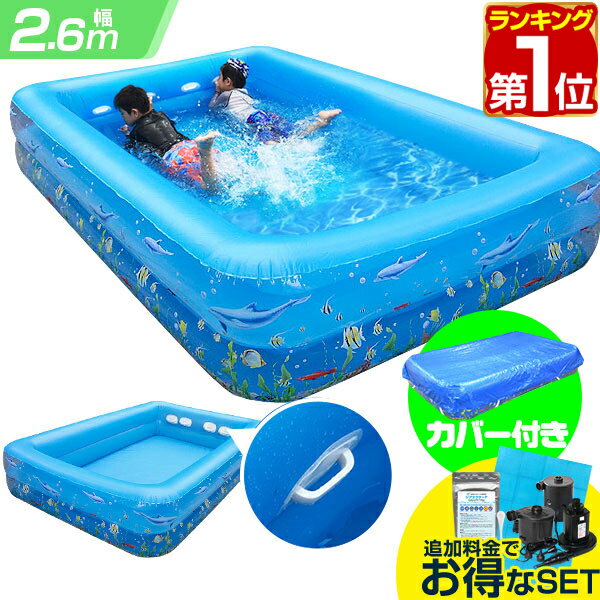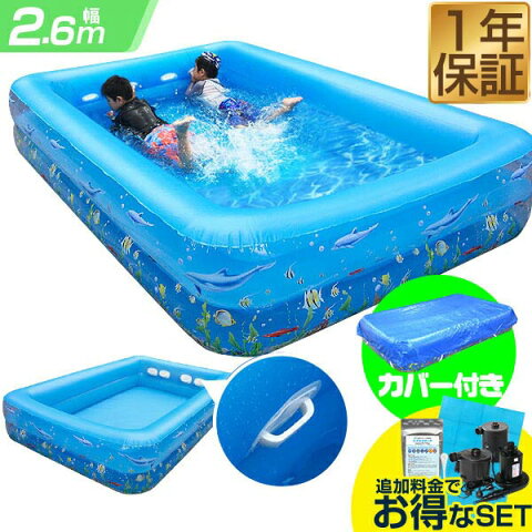 【楽天1位】プール 大型 2.6m ハンドル & プールカバー 付き ビニールプール ファミリープール 幅 260cm x 奥行き 170cm x 高さ 45cm 庭 ベランダ 除菌剤 消毒 電動ポンプ 空気入れ バタ足 練習 水泳 水あそび 家庭用プール 子供用プール 1年保証 ★[送料無料][あす楽]