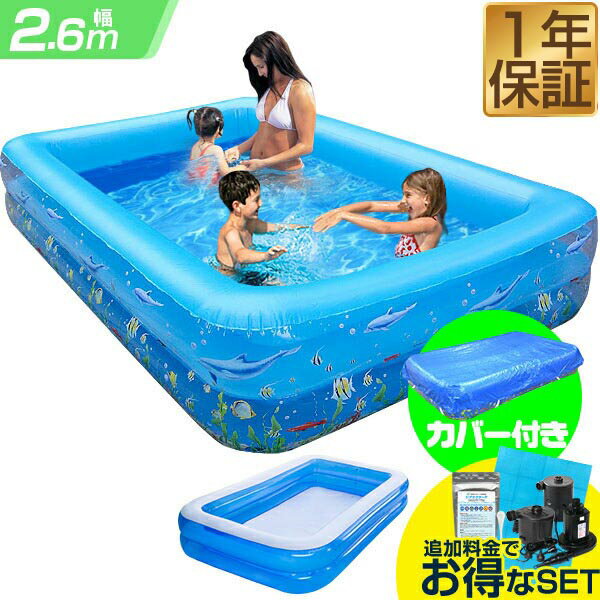 【楽天1位】プール 大型 2.6m プールカバー 付き ビニールプール ファミリープール 幅 260cm x 奥行き 170cm x 高さ 45cm 庭 ベランダ 除菌剤 消毒 電動ポンプ 空気入れ 水あそび キッズプール 家庭用プール 子供用プール 1年保証 ★[送料無料][あす楽]