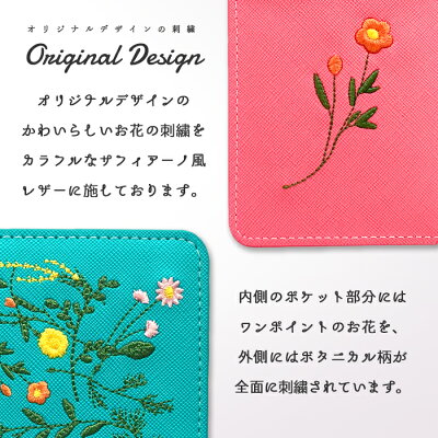 オリジナルデザインのボタニカル柄を全面に刺繍した大人かわいい手帳型ケースです。